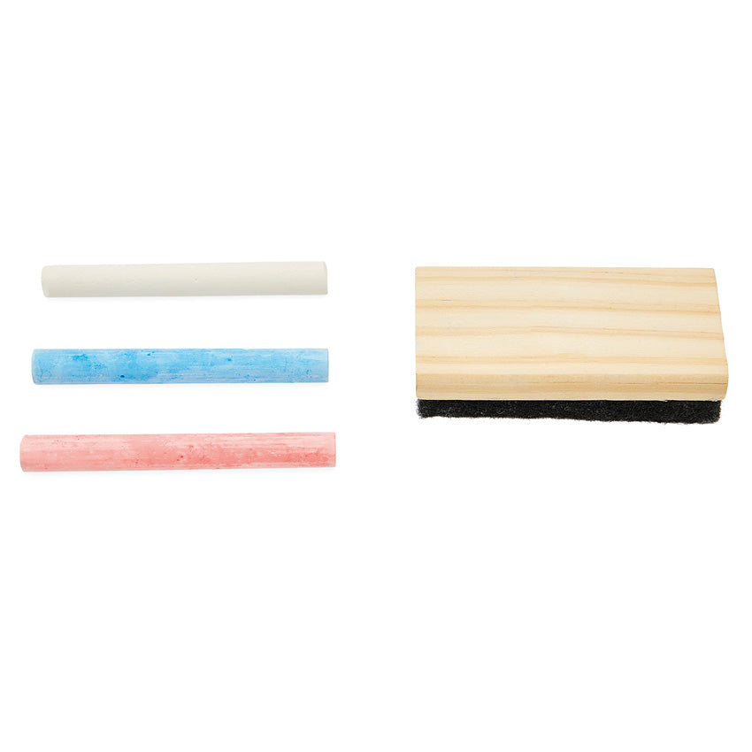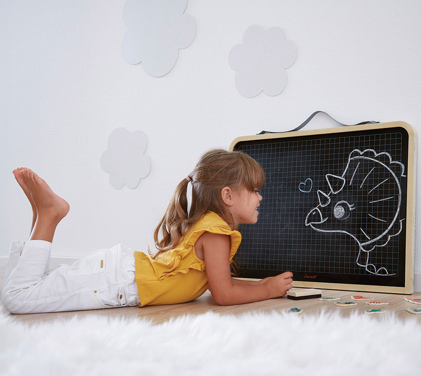 Let your child draw as much as they want on this large double-sided 2 in 1 magnetic black board. One side with a grid that can guide writing but can also be an area for games and colouring. On the other side, a plain surface allowing total freedom of expression. Both sides are magnetic and can accommodate magnets. The magnetic board comes with 3 pieces of chalk: white, blue and red, a brush for erasing, and a wooden holder to fix the board to the wall. Ideal for developing imagination and creativity and perfect for role play with playing teacher or school. Made from FSC wood and perfect for children over 3 years old.