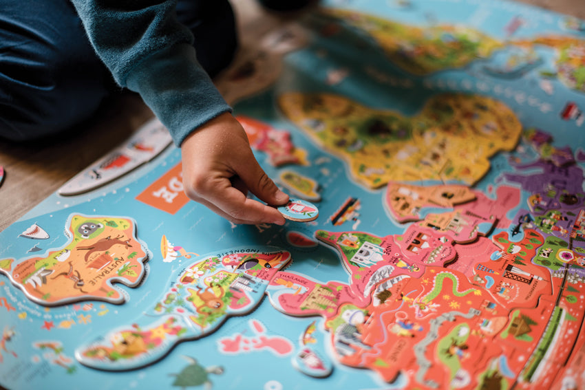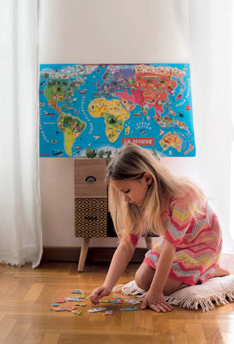 A magnificent wooden world map that assists in geographical learning. Made from wood, this huge 92 piece puzzle has a base board with corresponding country names to match the magnetic pieces depicting typical images from that country. Not only is it a great educational tool but loads of fun as well. Can be easily hung on the wall and makes a great room decoration too.