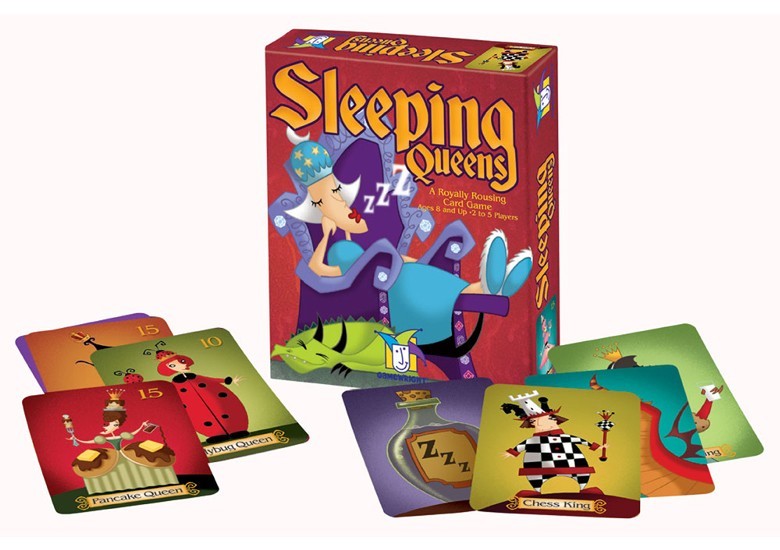 Rise and Shine! The Pancake Queen, the Ladybug Queen and ten of their closest friends have fallen under a sleeping spell and it's your job to wake them up. Use strategy, quick thinking and a little luck to rouse these napping nobles from their royal slumbers. Play a knight to steal a queen or take a chance on a juggling jester. But watch out for wicked potions and dastardly dragons! The player who wakes the most queens wins. Imagine a place where there's a queen of all pancakes, a king of cookies and a pack of over-protective dragons. If this sounds like something out of a dream, it actually is! Sleeping Queens was invented by 6-year-old Miranda Evarts, who thought up the game one night when she couldn't fall asleep. She awoke the next morning and with help from her older sister, Madeleine and her parents, Denise and Max created this wonderfully whimsical world of napping nobles. As you immerse yourself in the Evarts's fantasyland, you will find a game that helps develop memory, strategy, and elementary arithmetic skills. Just be careful when playing potion cards or you could wind up putting all the players to sleep!
